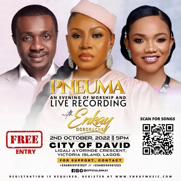 The worship and live recording concert with PNEUMA Today October 2nd, 2022 by 5 pm at the City of David, Ligali Ayorinde Crescent, Victoria Island, Lagos. All details are in the flyer. Register at www.enkaymusic.com. Don’t come alone, come with someone and get ready to be blessed!